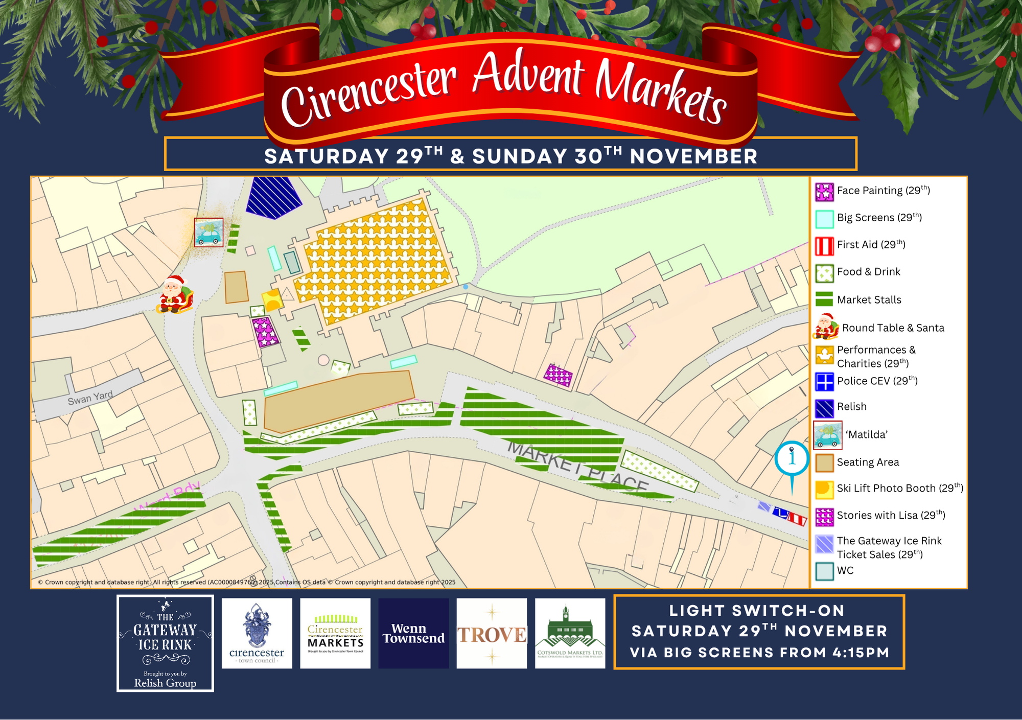 At approximately 4.30pm on Saturday, the Light Switch On ceremony, will be played across 3 Big Screens. Our lead sponsor,The Gateway, brought to you by the Relish Group, accompanied by the Mayor of Cirencester, Cannon Graham Morris and Cirencester’s self proclaimed ‘Mr. Christmas’, Vernon Harwood will be featured. Street entertainment and low noise fireworks will take place in the Market Place to add to the festive atmosphere.