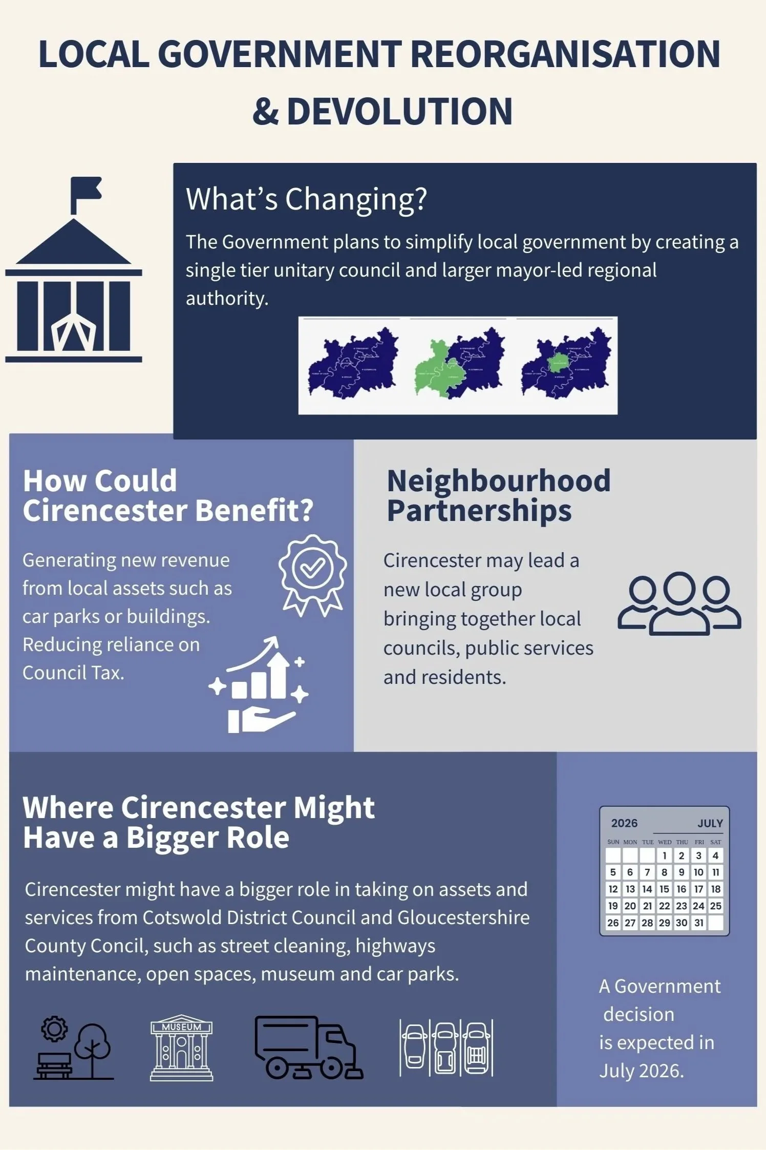 It is important that the local council sector is fit for purpose in being able to work effectively in partnership within a two-tier local government structure and can deliver local services and provide resources at a local community level. Cirencester Town Council will act as a champion for the residents of Cirencester to ensure the town gets the very most of the opportunities of devolution. This will include consideration of the acquiring of assets such as car parks, buildings, and services from which revenue can be raised to reduce the reliance on raising a precept through the council tax.